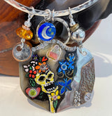 This charismatic necklace is a nod to Frida Kahlo's skull series. It is a whimsical mix of vibrant colours, gemstones and textures. The hand painted butterflies are streaming out of our pretty skull's mouth - right into the chops of the smiling cat! Perhaps Out One Mouth In The Other is a commentary on how news travels? The cool thing about art is you can take away whatever meaning you want. Bottom line- it's a fun piece of wearable art!