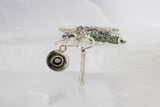 The cupped sterling silver dish off the bottom holds a genuine opal set in black resin. It looks like a third eye, bringing the wearer enhanced intuition and protection.The tiny key is a casting of old European church key gifted to Karyn many years ago. Keys are symbolic of a new door opening. We love mixing materials at Karyn Chopik Studio! The result is dramatic, creating a layering of color and texture both pleasing to the eye and to your wonderful enlightened soul!