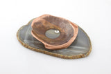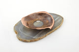 Mixed media. Hand sculpted copper bowl on agate slab, with sterling silver bezel around cubic zirconia. Set in art resin.