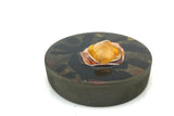 Hope resembles the sun bursting forth into the darkness of uncharted sky. Part of Karyn's tiny "Portal" series this one of a kind art piece combines her life time exploration of sculptural metal and crystal. She has set the beautiful citrine sun in resin on an hand painted backdrop.
