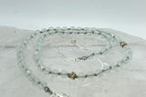 Hand knotted on grey silk thread this Opalite faceted beaded strand is a perfect fit for your Spring 2024 colour palette! Opalite is a man made glass with an opalescent sheen throwing soft blue, and creamy yellow tones. We added antiqued brass washers and sparkling crystal roundel spacers for an extra sparkle.