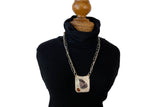 The necklace is finished with a handcrafted sterling silver chain and a hand-punched rectangular silver accent, offering a perfect blend of elegance and artistry.